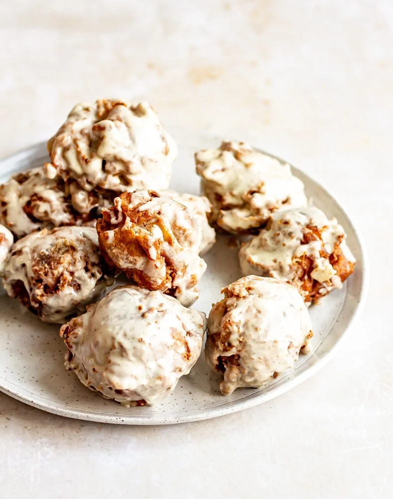 - While the fritters are cooling slightly, whisk together glaze ingredients in a large bowl until smooth. Either toss the warm fritters in the glaze or pour the glaze over top of the warm fritters. Serve warm.